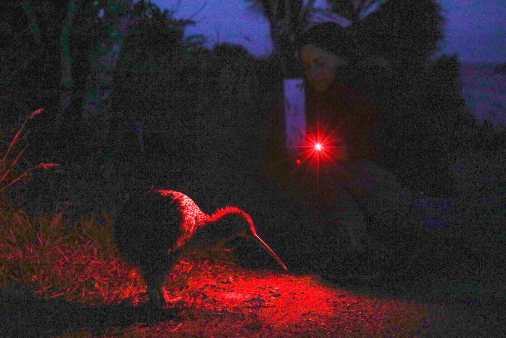 野生のkiwiを探す時は明るい白いライトではなく、赤いフィルムをしたライトで探してください。赤いライトはkiwiには見えないらしい。